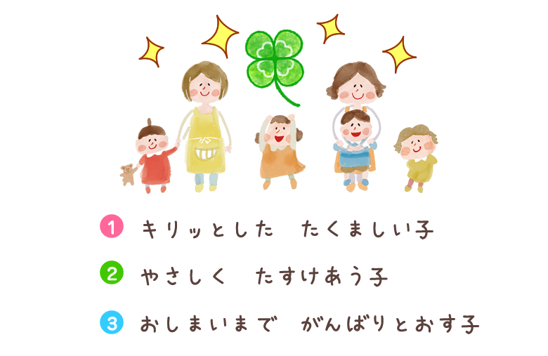 当園は、幼児期における教育・保育を、生涯にわたる人格形成の基礎を培う重要なものであると位置付け、以下の運営方針に基づき幼児教育・保育を一体的に提供してまいります。