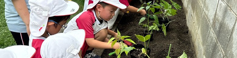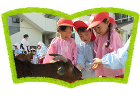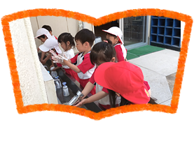 カメ・メダカ等を飼育し、それらを観察する中で動物への愛情を育て、さらに1日動物村を開き、動物とのふれあいも経験します。また、四季折々に咲く花や、ミカン・キンカン・ウメなど園庭の果実植物にふれることから、四季の移り変わりを肌で感じるとともに、動植物への愛情を育て親しみを持たせます。
