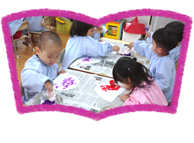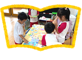 絵本・紙芝居・カルタ等を通して想像力を豊かにし、日常生活の中にある文字などの記号への関心が自然な形で育つよう指導を行っています。