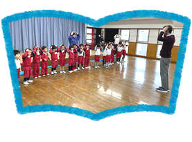 月に1回(3歳児は6月より)外国人の講師の先生が来て、歌に合わせて踊ったり、ゲームをしたりします。 それらの活動に繰り返し取り組むことで、先生と少しずつ簡単なコミュニケーションが取れるようになってきています。