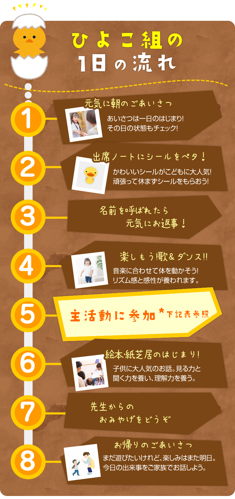未就園児(2歳児)を対象に、 親子で参加して頂ける「ひよこ組」があります。 ひよこ組では、遊びを主とした保育を行います。 歌やダンスをしたり、季節に応じた制作をしたり園行事への参加など、 一人ひとりが興味をもてることに取り組んでいます。