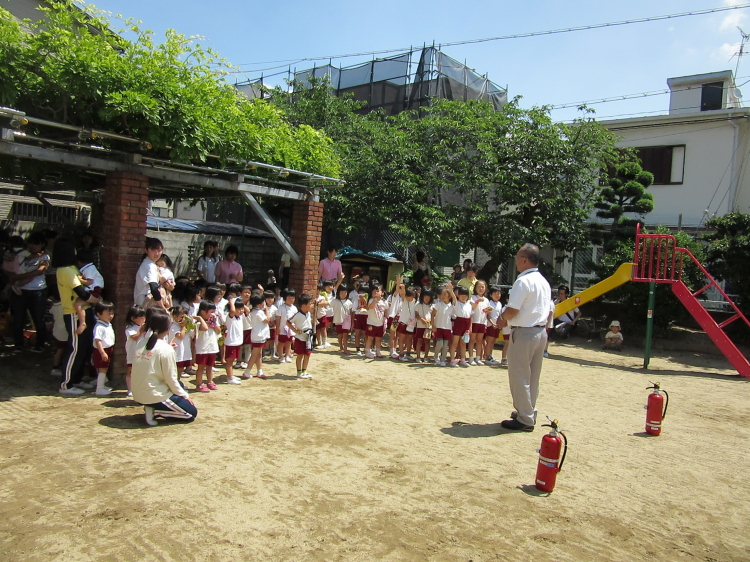 避難訓練 幼稚園で火事が起こった時のために避難訓練を行いました。 消防車が駆けつけ、職員やひよこぐみの保護者の方に実際に消火器を使って消火訓練をしたり、消防車の近くで見学をしたりしました。 子どもたちも間近で見る消防車に大興奮の様子でした。 改めて火事、火の危険性を知り、避難の際の約束事を教えてもらいました。
