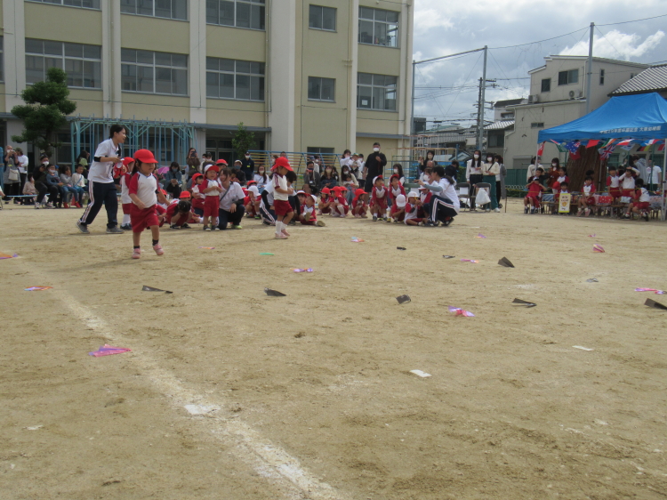 いっしょにいこう!は好きなどうぶつを引っ張ってあげて走っている姿に「可愛い〜♡」という声があがっていました♪GOOD LUCKY!!では先生たちと緑組さんと一緒にとっても可愛く踊ってくれている姿が見られました!どうぶつタッチでは緊張しながらもどうぶつたちに向かって頑張って走ってくれていました。最後のフープリレーでは疲れもあったと思いますが保護者の方と一緒に出られて力を振り絞ってくれていたと思います!