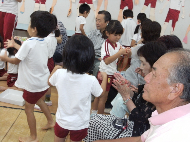 敬老会 9月13日金曜日に敬老会がありました。 まず初めに、3階のホールで各クラスからお歌のプレゼントがありました。 おじいさんおばあさんは元気に歌う子ども達と一緒に口ずさんだり、楽しんでいました。 お歌のプレゼントの後は、お部屋に分かれて折り紙やお手玉、あやとりなど 昔ながらの遊びを一緒に楽しんでいました。