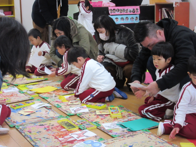 事前にどんな絵があるのか子どもたちに見せ、子どもたちは自分が出たものに対して、「あー!私はねこだ!」と喜んだり驚いたりする様子が見られました。